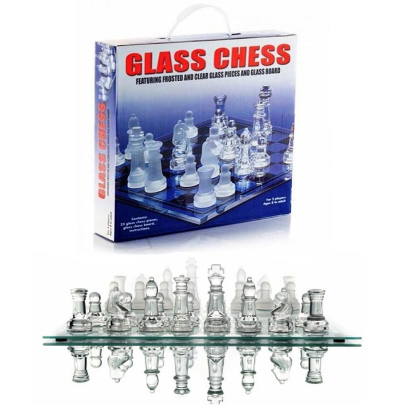 Стаклен шах со сјајни и мат фигури.