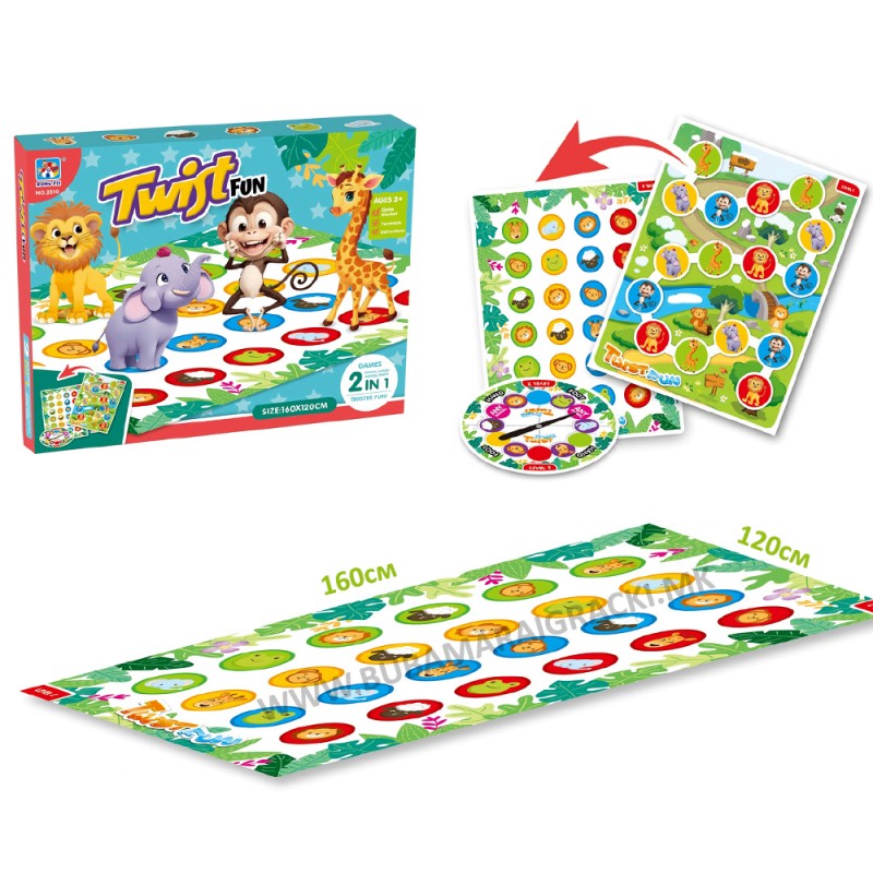 Уживајте со забавната игра! Оваа игра со животинска тема Twister Junior вклучува двострана подлога и спинер. Изберете една од игрите: Животинско Сафари, целта на играта е кој ќе стигне прв до целта на турнејата Сафари, попатно најмалите ќе можат да откриваат бои или да го имитираат однесувањето или звуците на животните на кои стојат. Превртете ја подлогата за да напредувате на забавната игра Wild Party. Свртете го спинерот за да дознаете кое животно или боја на подлогата играчот треба да ја стави раката или ногата. Кој ќе биде последниот играч кој ќе стои!