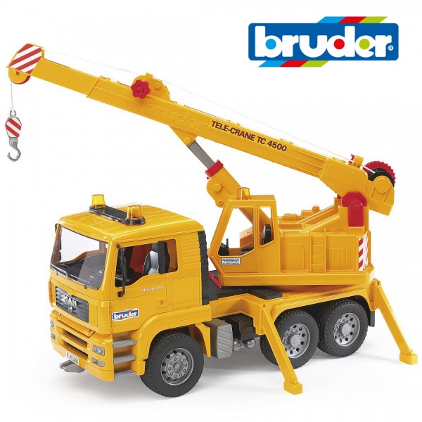Bruder MAN TGA Камион со Кран. Уникатноста во деталите и функциите на овој камион MAN TGA со кран е нешто што го инспирираше германскиот производител Bruder да го додаде овој производ како реплика во својата колекција од играчки, кои со децении се единствени и незаменливи на пазарот за висококвалитетни играчки во повеќе од 70 земји во светот. Ретровизорите на кабината можат да се преклопат. Додатниот кран може да се заврти за 360° за поголема прегледност. Кранот со кука може да се извади со помош на црвеното ротирачкото тркало и висината да се прилагоди со помош на хидрауликата. Камионот со кран има дополнителни четири потпорни ногарки кои му обезбедуваат поголема стабилност на кранот за работа.