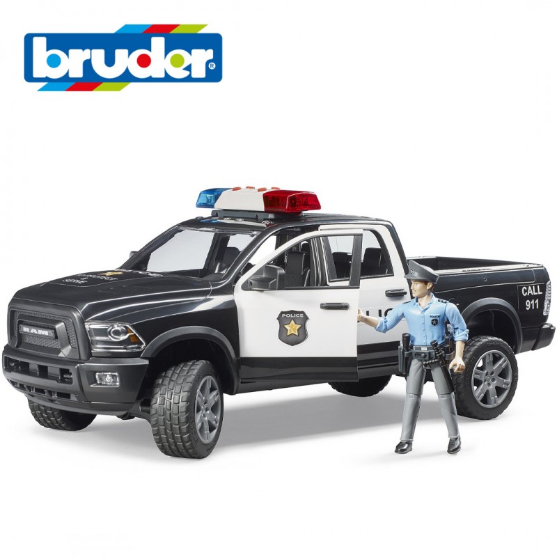 BRUDER Полициски 4x4 Pick-up – подготвен за акција надвор од градот! Полициските служби на BRUDER се збогатуваат со моќен 4x4 полициски pick-up камион, совршен за непристапни терени надвор од градските улици. Моделот е базиран на познатиот RAM 2500, со препознатлив дизајн инспириран од американската полиција и опремен со светлосен и звучен модул на покривот.