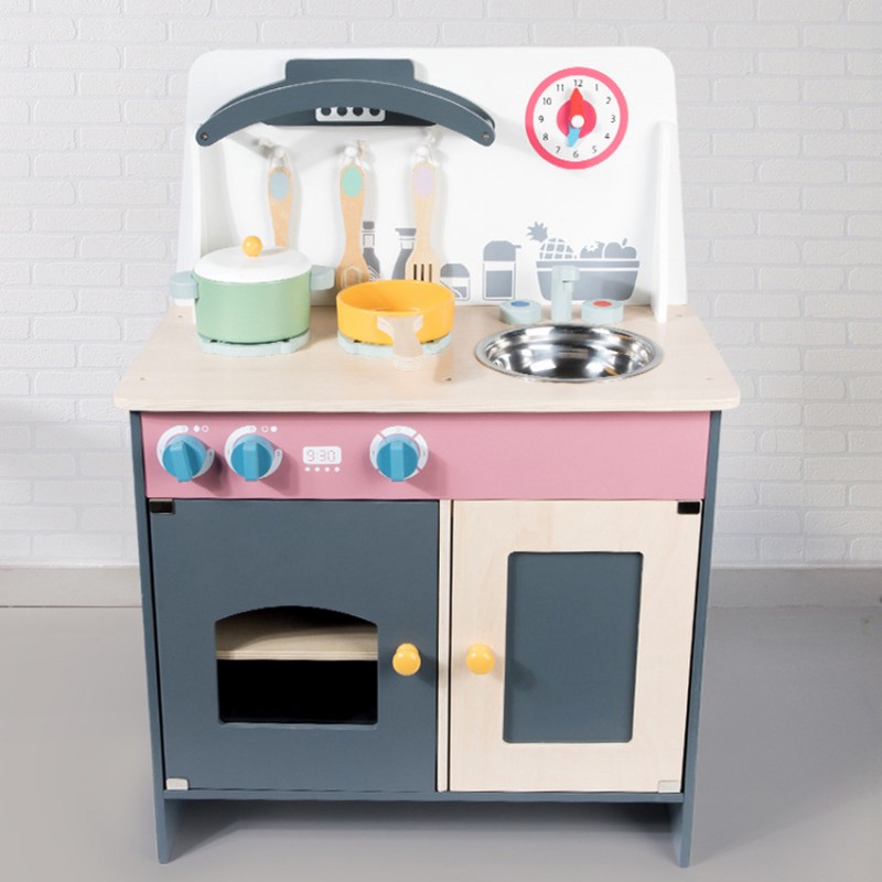 Вашето дете ќе стане вистински готвач со оваа модерна кујна. Прекрасна дрвена кујна специјално направена за малите готвачи кои сакаат да ги направат своите први чекори во готвењето. Вклучени се тава, тенџере со капак и 3 кујнски алатки(лажица, шпатула и вилушка).