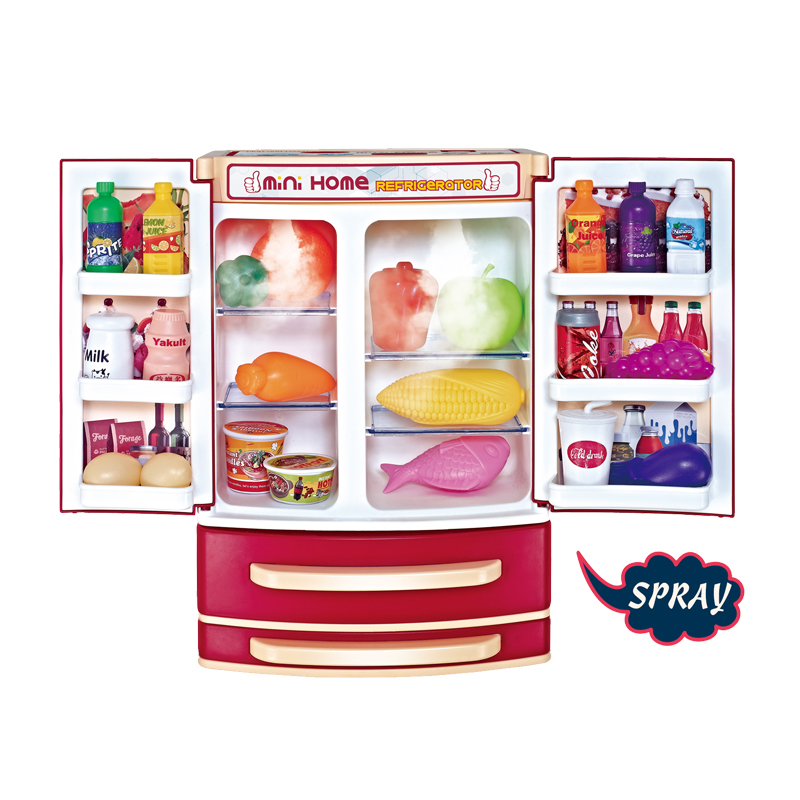 Прекрасен фрижидер полн со свежа храна! Со пристискање на копче фрижидерот испушта чад, со ефект на ладење. Горниот дел се полни со вода, копче за музика.