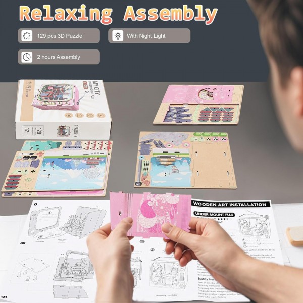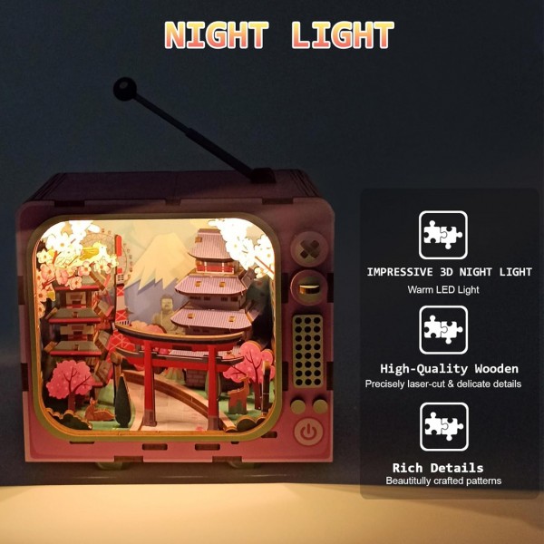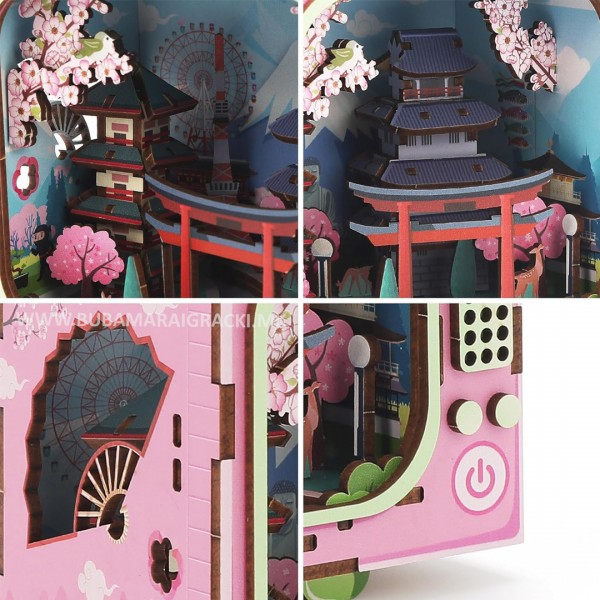Запознајте ја величенствената убавина на јапонскиот пејзаж со оваа прекрасна минијатурна 3Д сложувалка. Создавајте минијатурен градски пејзаж со планината Фуџи во позадина, развивајте трпение, креативност и уживајте во часови на забава и учење. Внатрешно е осветлено, треба да поставите лед лента, батерии се вклучени во пакувањето.