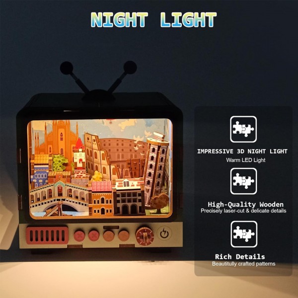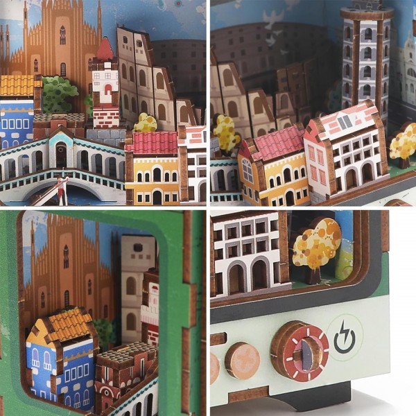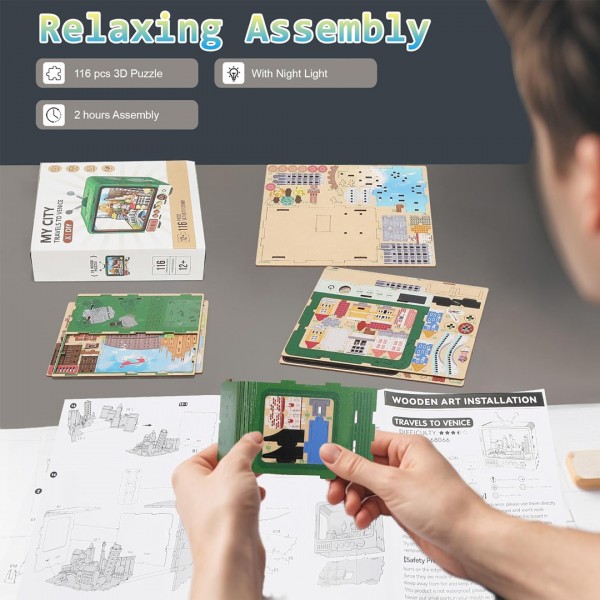 Создавајте минијатурен градски пејзаж со канали, шармантни улички, развивајте трпение, креативност и уживајте во часови на забава и учење. Откријте ја романтичната Венеција со оваа прекрасна сложувалка од 116 делови. Внатрешно е осветлено, треба да поставите лед лента, батерии се вклучени во пакувањето.