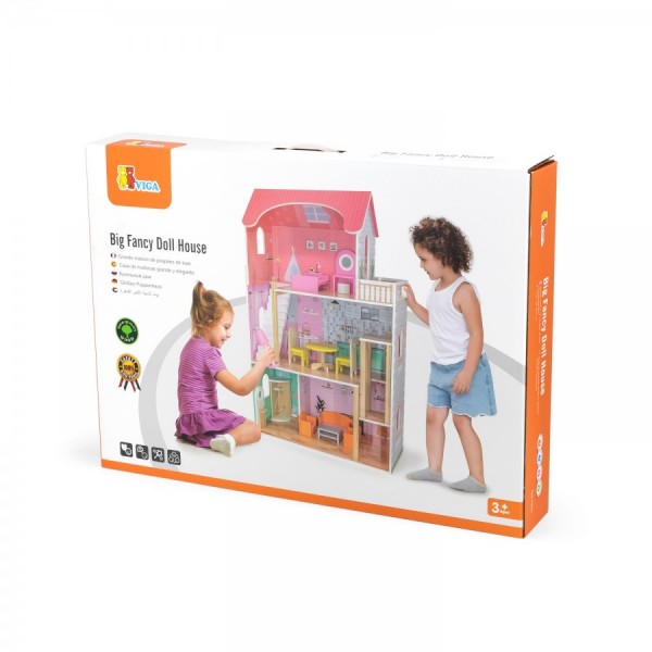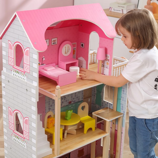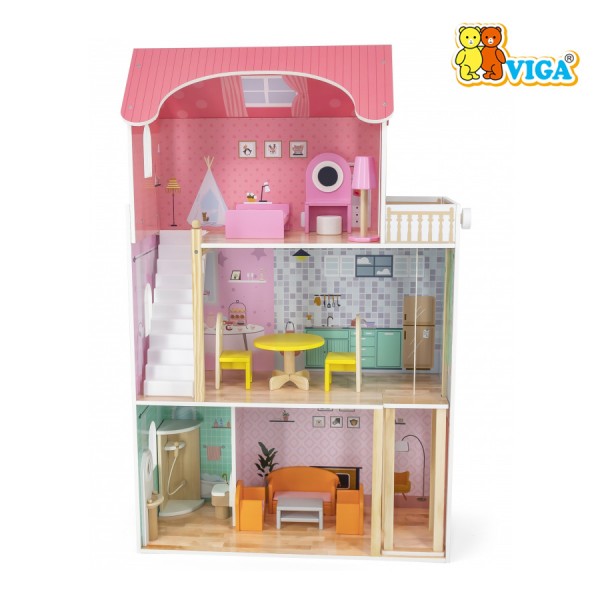 Прекрасна дрвена куќичка за кукли која ќе ги воодушеви вашите малечки принцези. Куќичката е на три ката со три прекрасни соби во која секоја има своја приказна. Куќичката има кујна со трпезарија, дневна соба, купатило, спална собa, лифт и совршена тераса за релаксација.