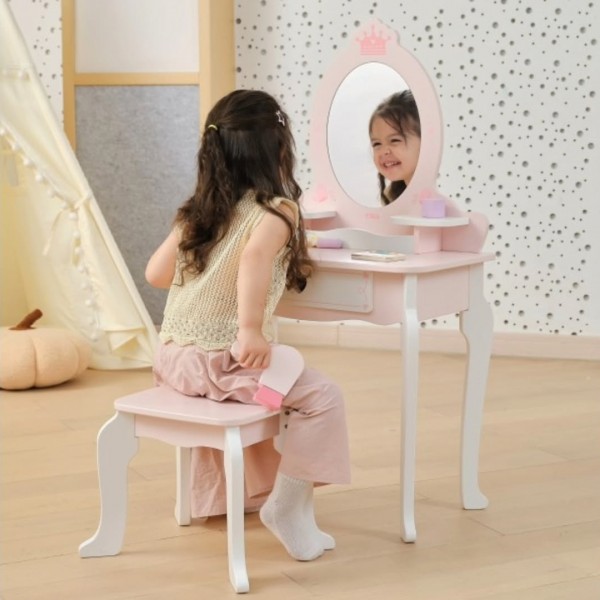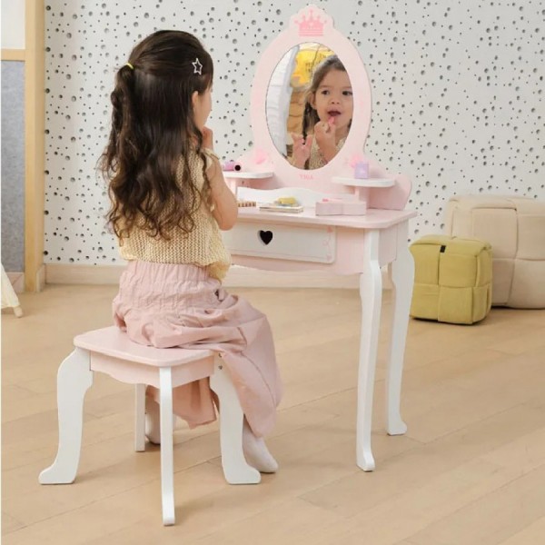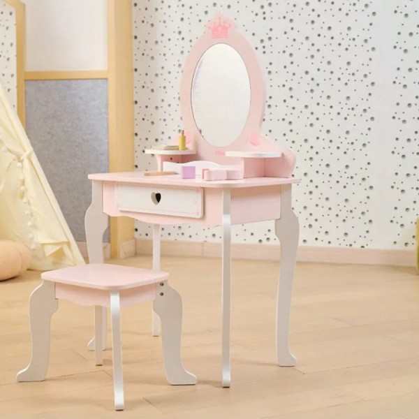 Viga дрвено козметичко огледало со столче, за малите принцези што обожаваат да се разубавуваат. Прекрасен дрвен сет, изработен од квалитетно дрво и нетоксични бои. Огледало со безбедносен дизајн, без стакло.