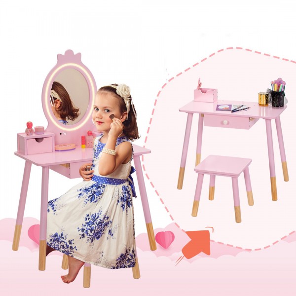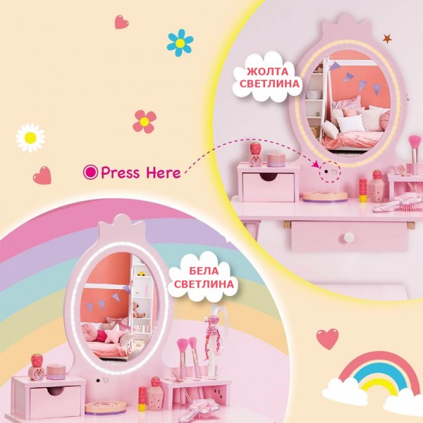 Прекрасно дрвено кометичко огледало за сите мали принцези со led светло кое свети во две бои ,жолто и бело. Кога ќе се извади огледалото, добивате работна маса за пишување или цртање.
