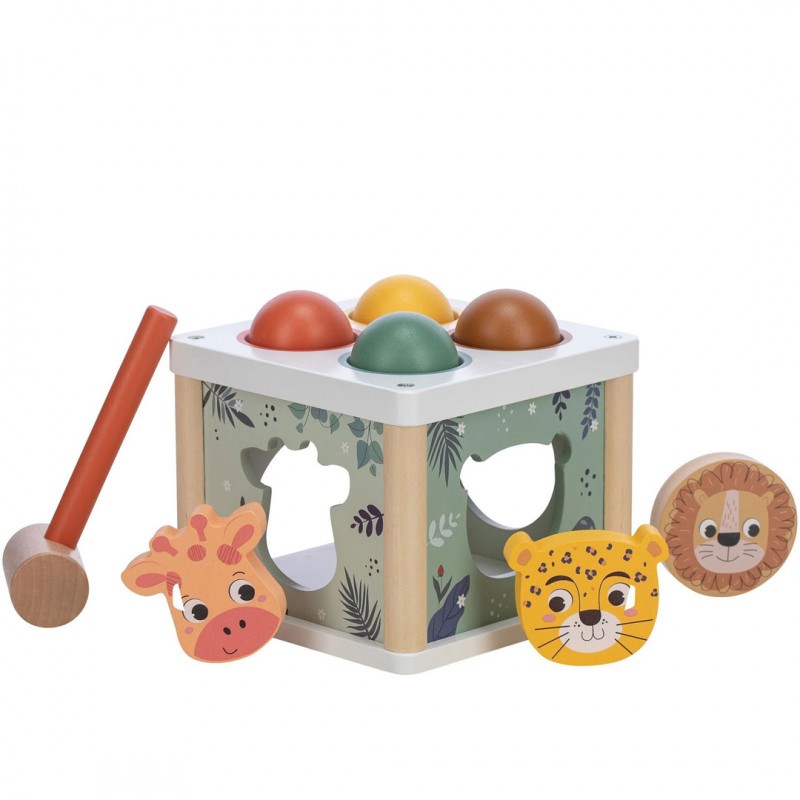 Забавна и едукативна коцка сортер Free 2 Play. 3 Колоритни форми со животни ќе го забавуваат Вашето малечко, за дополнителна забава има 4 топчиња кои со помош на чеканчето треба да се протнат низ отворот. Одлична можност за учење, развој на моториката и координацијата.