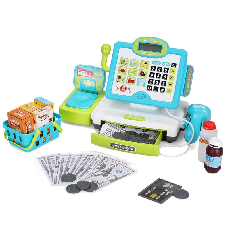 Фискална каса забавен производ за сите деца. Фискалната каса има монети, кредитна картичка, скенер, вага, производи, корпа... Фискалната каса работи како калкулатор.