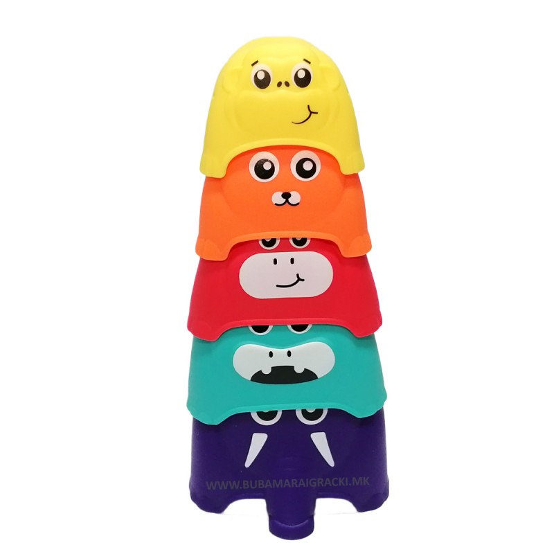 Забавни и едукативни чаши сортер со ликови на животни кои се изработени од квалитетна пластика со заоблени рабови. Сет од пет чаши со различна големина, боја и секоја представува различно животно, одлична можност Вашето дете да изгради кула и да ги научи боите. Одлична можност за учење, развој на моториката и координацијата.