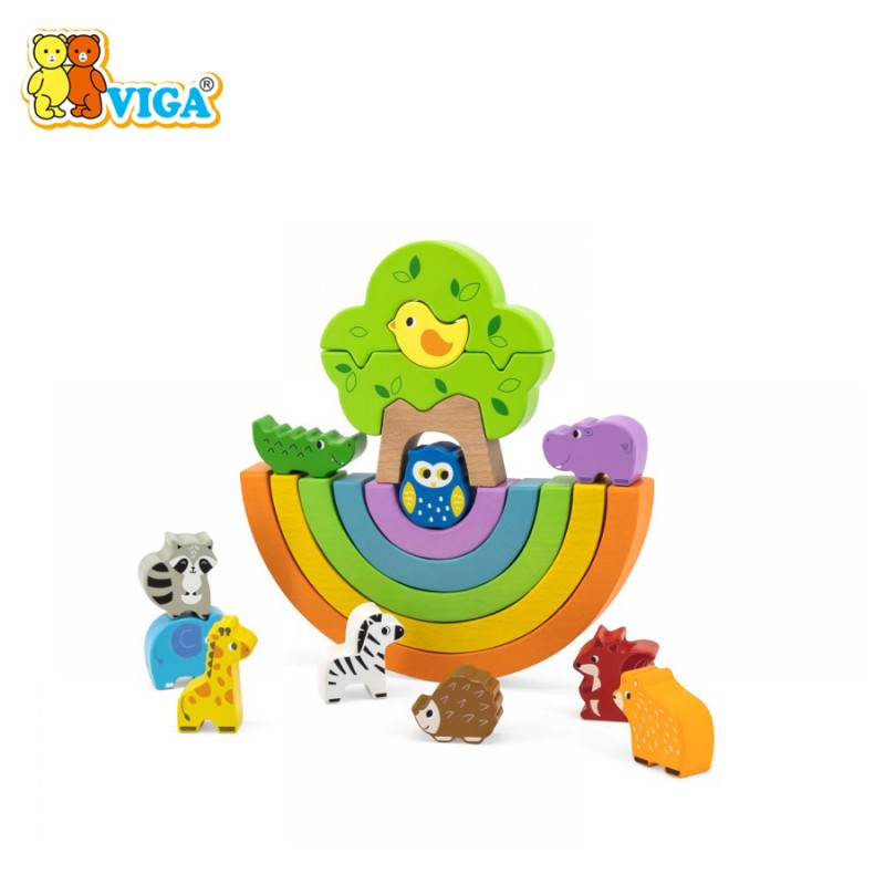 Прекрасна креативна игра со балансирање на Вига. Сетот вклучува 5 дрвени полукружни делови во различни бои како и 11 дрвени животни и 3 делови за дрво. Изработени од квалитетно дрво и нетоксични бои, Вига играчките се одличен производ за подобрување на координацијата и моториката на малите креативци.