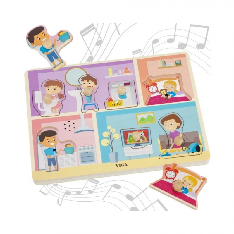 Интерактивна едукативна сложувалка што го воведува детето во светот на секојдневните рутини како готвење, чистење и миење заби. При секое точно поставување, активира реалистичен звук.Поттикнува самостојност и развој на добри навики,jа зајакнува моториката, меморијата и логичкото размислување. Изработена од безбедно дрво со вграден звучен модул.