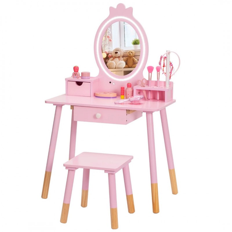 Дрвено козметичко огледало со столче, совршен подарок за секоја мала принцеза. Може да се користи како масичка за учење или како масичка со огледало за разубавување