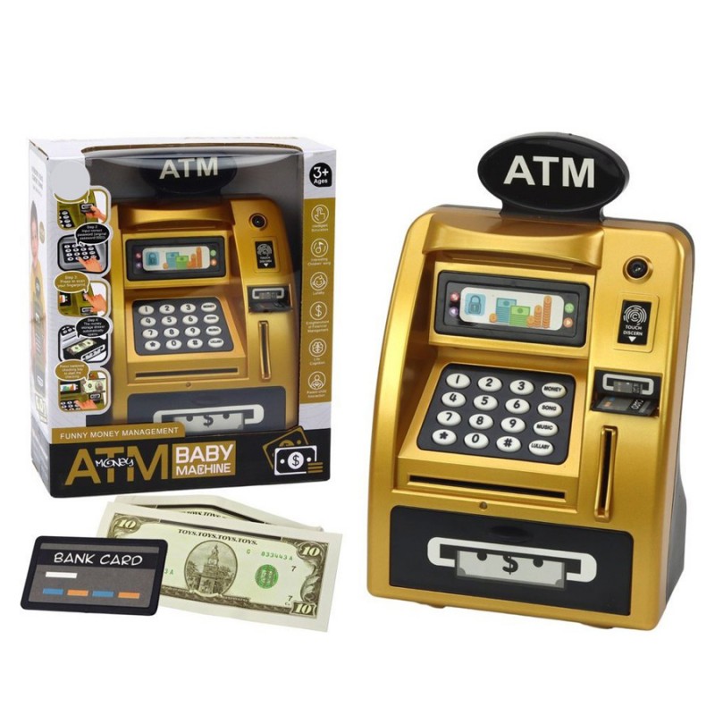 Смарт касичка за чување пари. Вметнете ја картичката, внесете ја точната лозинката 0000, притиснете го отпечатокот и касата автоматски ќе се отвори. Во касичката има отвор за вметнување на хартиени и ковани парички. Ставете хартиена пара во отворот и банкоматот автоматски ќе ја повлече и ќе ви ја сочува во касичката