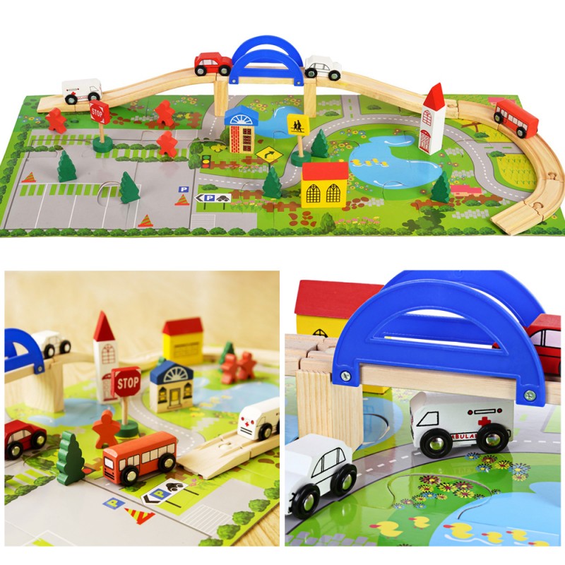 Прекрасна дрвена стаза со возила. Направете ваш мини град. Сетот е составен од 40 делови. Подлогата е од тврд картон и се составува како сложувалка од 8 делови.