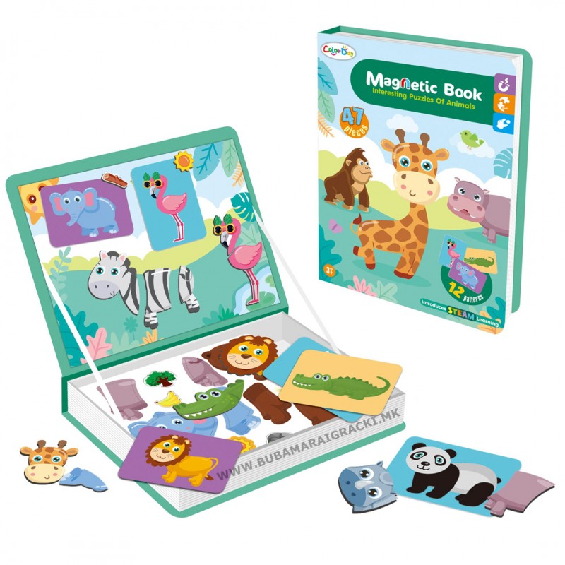 Прекрасна едукативна магнетна книга со животни. Едноставно поставете ја картичката со слика на животното кое Вашето дете сака да го состави од магнетните делови.