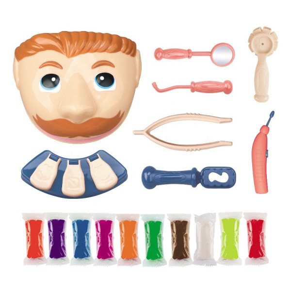 Сетот вклучува: машинка за поправање на заби, клешти за вадење на заби, огледалце, алатка за правење на пломби, модла за правење на заби од пластелин, четка, 10 пакетчиња пластелин и секако - пациентот!