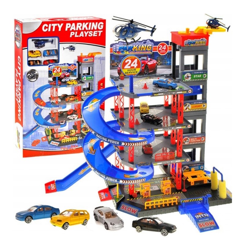 Супер забавна катна гаража со лифт, со многу паркинг места каде може да се паркираат автомобили и спуштачка патека каде што можат да се возат автомобилчињата.