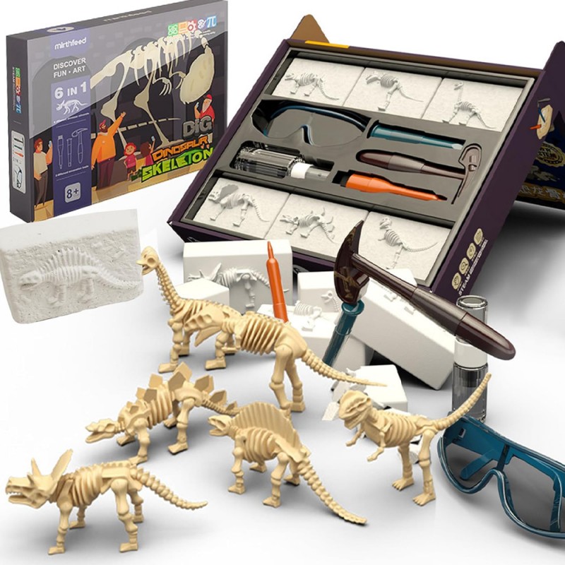 Во сетот се вклучени алатки за ископување, заштитни очила и 6 различни диносауруси( tirannosaurus Rex,Brachiosaurus,Spinosaurus,Stegosaurus,Dilophosaurus,Triceratops).
