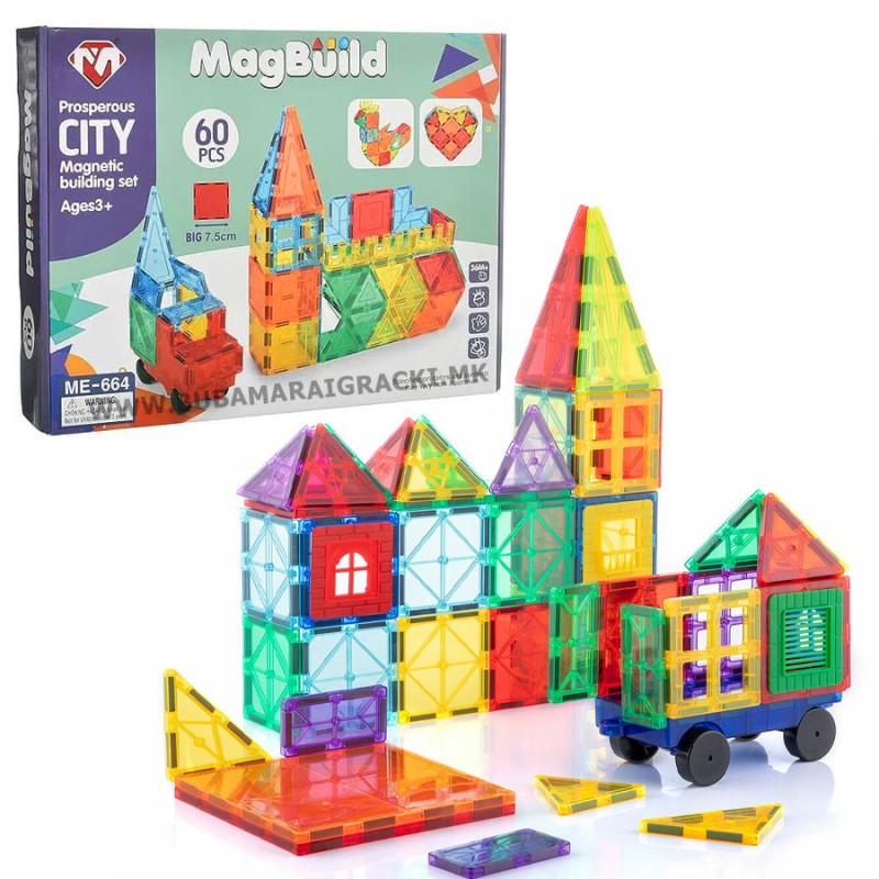 Откријте ја забавата на градењето со овој магнетен сет со 60 делови, кој вклучува и тркала.