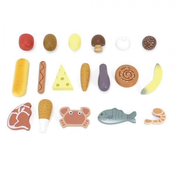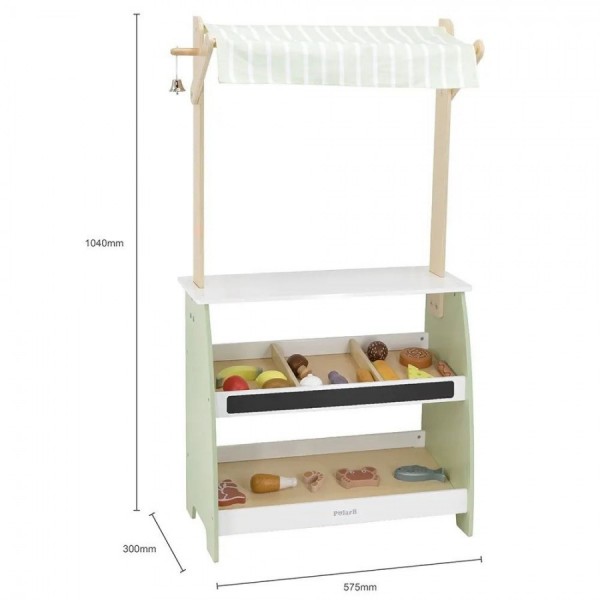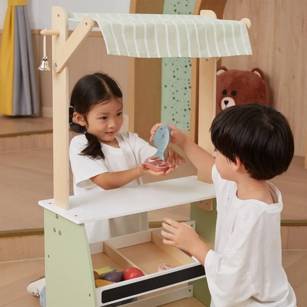 Прекрасен дрвен пазар со прегради за овошје, зеленчук и останати намирници. На пазарчето можете да купите банани,киви, лимон, печурки, риба,месо, морков..... Автентичен дизајн, штанд со платнен покрив. На полиците има мини табла на која може да се пишува со креди, опис на производ, цени... Вклучени се 18 производи за игра: овошје, месо, зеленчик и други.