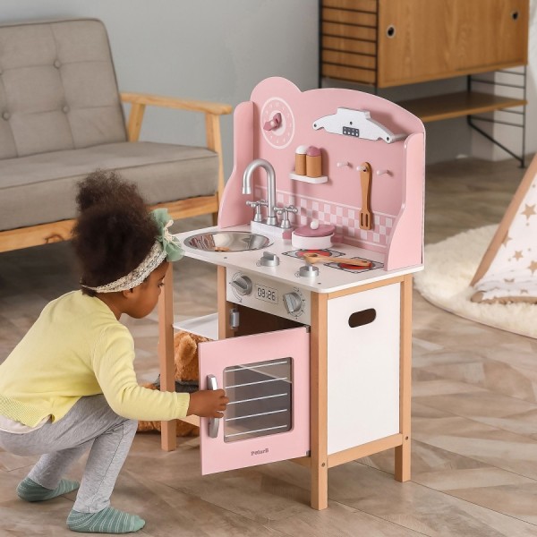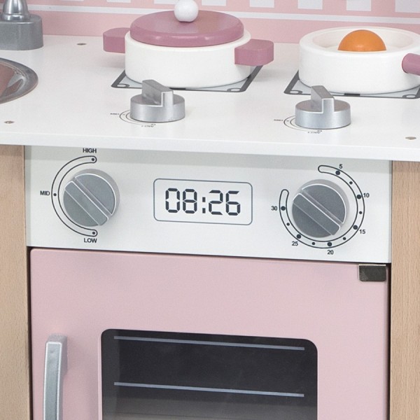 Вашето дете ќе стане вистински готвач со оваа модерна кујна. Прекрасна дрвена кујна специјално направена за малите готвачи кои сакаат да ги направат своите први чекори во готвењето.