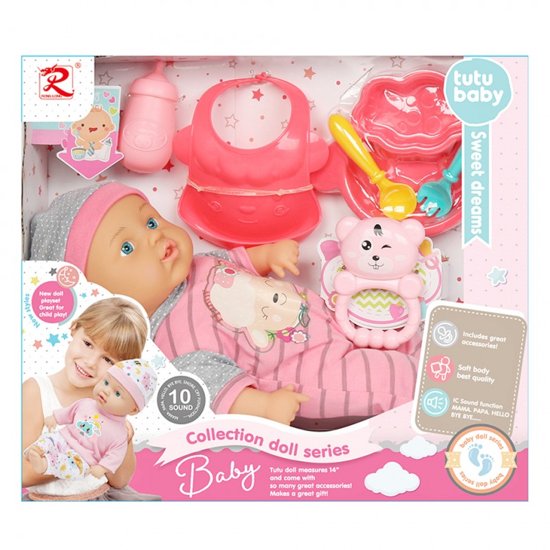 Прекрасно бебе со додатоци е совршен подарок за секое девојче! Бебето пие од неговото шишенце и има 10 различни звуци.