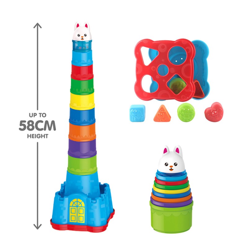 Забавен и едукативен замок сортер кој е изработен од квалитетна пластика со заоблени рабови. Сет од девет чаши со различна големина и боја, можност Вашето дете да изгради кула и да ги научи боите. Секоја чаша е обележана со слика на животно.Отворете го капакот за да ги извадите формите, 4 колоритни форми ќе го забавуваат Вашето малечко. Одлична можност за учење, развој на моториката и координацијата.