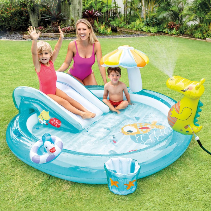Супер забава ова лето, прекрасен забавен центар со крокодил прскалка, лизгалка, гума во форма на пајче и кофичка. Супер забава за Вашите најмили. Водениот распрскувач треба да се поврзе со црево.