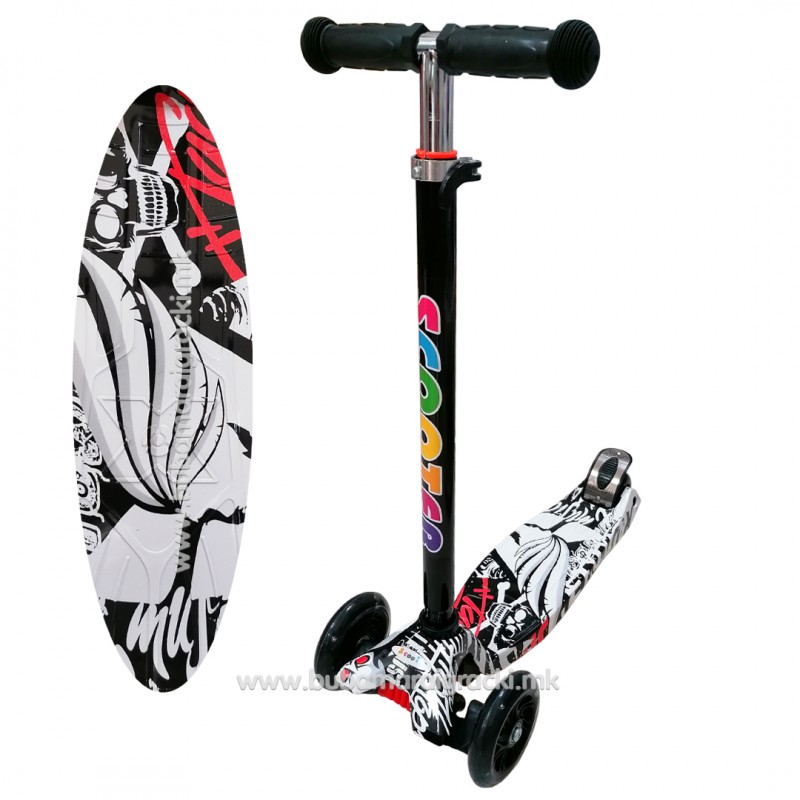 Супер квалитетен тротинет со шарена подлога и силиконски тркала. Тротинетот се вози по принципот наведни се и управувај.