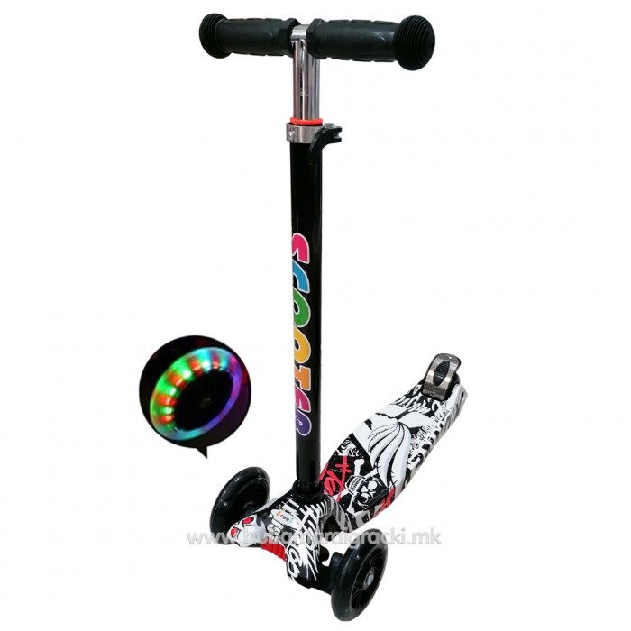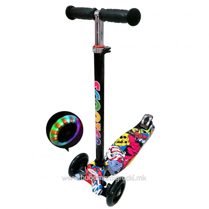 Супер квалитетен тротинет со шарена подлога и силиконски тркала. Тротинетот се вози по принципот нав..