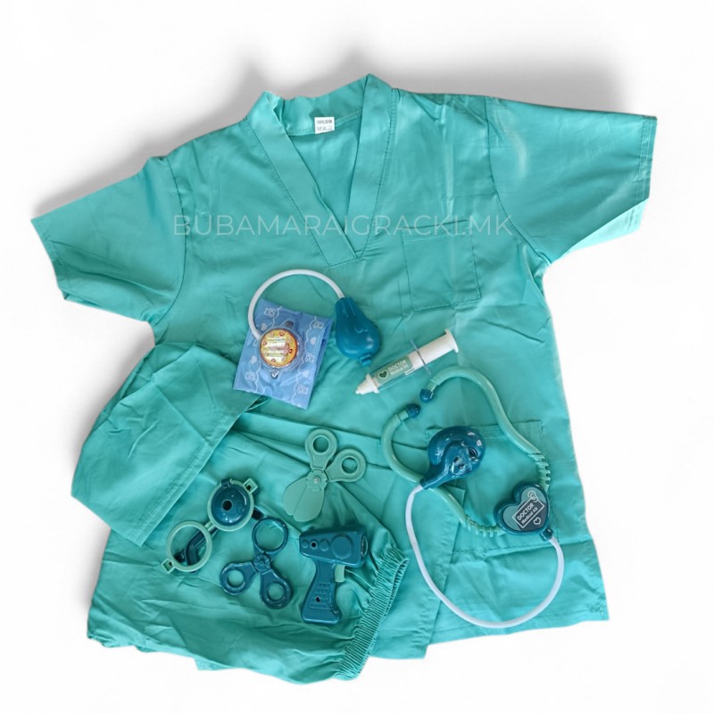 Детски костим за максенбал - Хирург. Сетот содржи униформа за хирург во препознатлива зелена боја, изработена од лесен и удобен материјал кој е пријатен за детската кожа. Покрај облеката, во сетот се вклучени и повеќе медицински додатоци за игра: