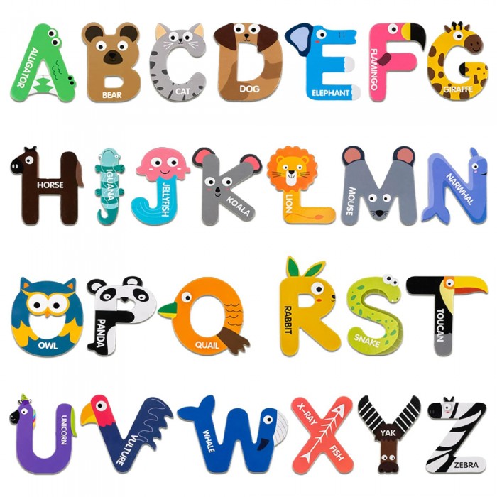 Магнетни букви од англиската азбука со пријателски ликови на животни ќе им помогнат на вашите малечк..