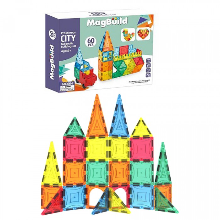 Откријте ја забавата на градењето со овој магнетен сет со 60 делови, кој вклучува и тркала.силни маг..