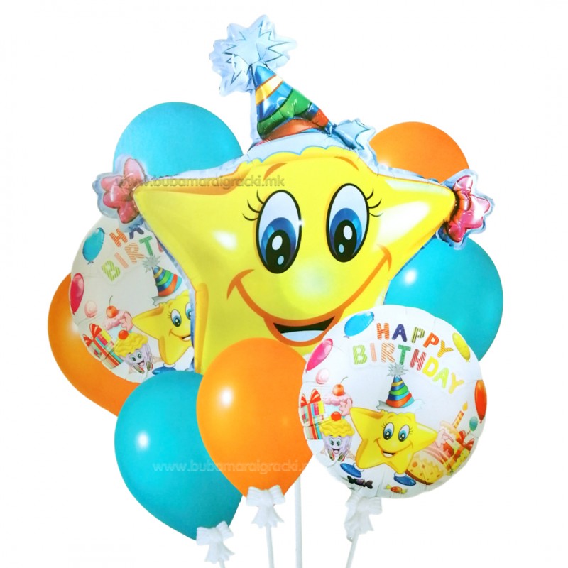 - 3 фолија балони: форма на ѕвезда 27" - 69см; кружни фолија балони 18" - 45см.