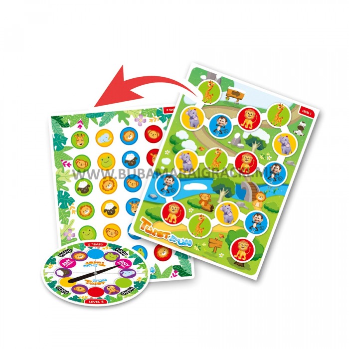 Уживајте со забавната игра! Оваа игра со животинска тема Twister Junior вклучува двострана подл..