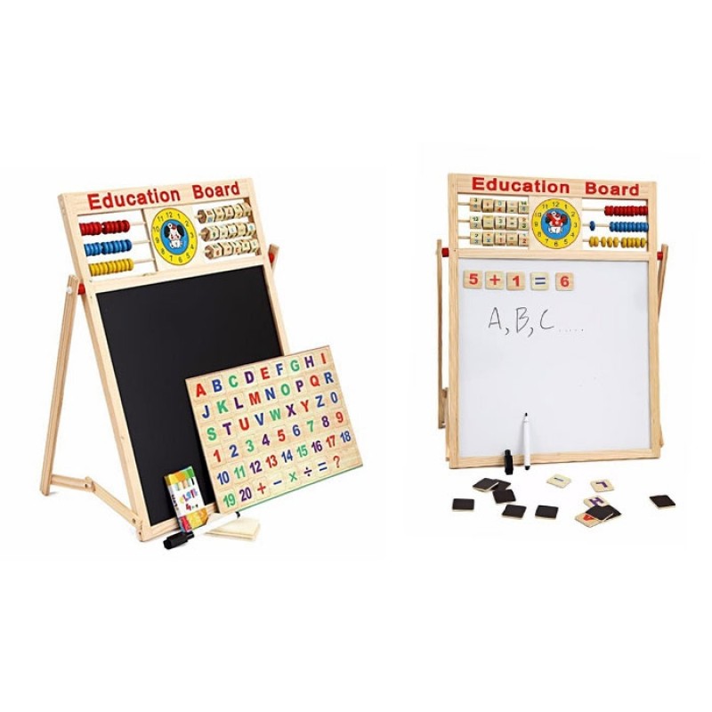 Супер подарок за секое детенце што сака да црта со фломастер, или пак со креди. Можност низ игра да се научат бројките,буквите, како и основни математички операции.Таблата е двострана, на едната се користи креда, на другата фломастер. Дополнително има магнетни букви и бројки, абакус, знаци за собирање,одземање...